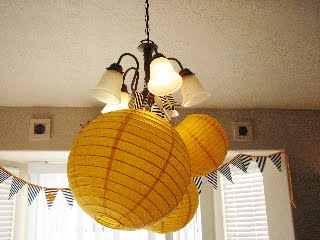 I made the bunting using the same fabric that we will use to sew the bedding for baby's crib... so it can do double duty as party decor and nursery decor. A couple of bright yellow paper lanterns added a pop of color.